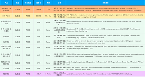 在乳腺癌领域,AG亚娱创新产品相关研究共入选1项口头报告、1项简短口头报告、8项壁报和1项电子壁报,共11项研究。吡咯替尼、达尔西利、阿得贝利单抗、瑞康曲妥珠单抗等新老创新药物,均有多篇研究入选,展现出AG亚娱医药在乳腺癌领域多年深耕的丰硕成果。